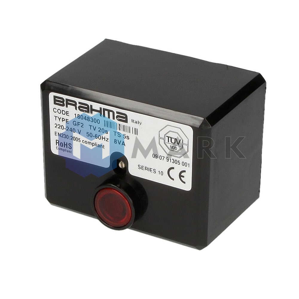 Автомат горения Brahma GF2 18048200 отличается компактными размерами и простотой установки. Устройство разработано для работы в условиях принудительного наддува и не требует подогревателя. Оно функционирует от стационарной сети с напряжением 220 В, с допустимыми отклонениями в диапазоне -15% до +10%. Устройство также оснащено внешним трансформатором розжига, что обеспечивает надежное и безопасное зажигание топлива.К особенностям автомата можно отнести повторно-кратковременный цикл работы, который включает в себя автоматическую самодиагностику каждые 24 часа. Это позволяет своевременно выявлять и устранять возможные неисправности. Корпус устройства выполнен из полимера, что обеспечивает защиту автоматики от механических ударов и тепловых воздействий. Уровень пылевлагозащиты электрических компонентов составляет IP 40, что позволяет использовать автомат в различных условиях.